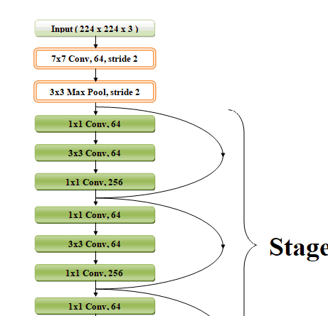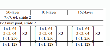 1) 첫 단계에서7x7x64 conv layer가 있다. 이는 stride 2이며, input size가 224x224인데 output이 112x112이므로 padding=3이다. 그 다음3x3 max pool layer는 stride가 2이고 112x112->56x56 이므로 padding=1이다.