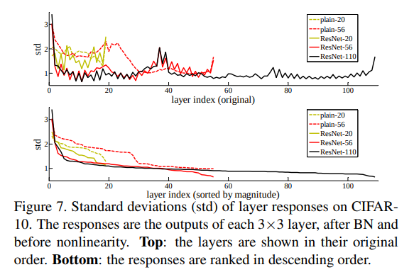 Fig. 7은 layer response의 표준편차를 보여준다. 이러한 response들은 3x3 layer, BN 다음의 출력이다(ReLU 이전!).