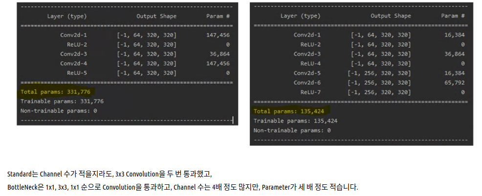 BottleNeck 구조는 다음과 같다. Input과 Output * expansion이 같다면 굳이 projection shortcut을 쓸 필요가 없다. 그러나 구조를 잘 보면