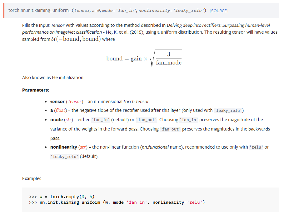 10)nn.init.kaiming_normal_(m.weight, mode='fan_out', nonlinearity='relu')라는 코드가 있다. 이를 살펴보자(참고로 He initialization = Kaiming Initialization). 먼저 PyTorch 공식 설명이다