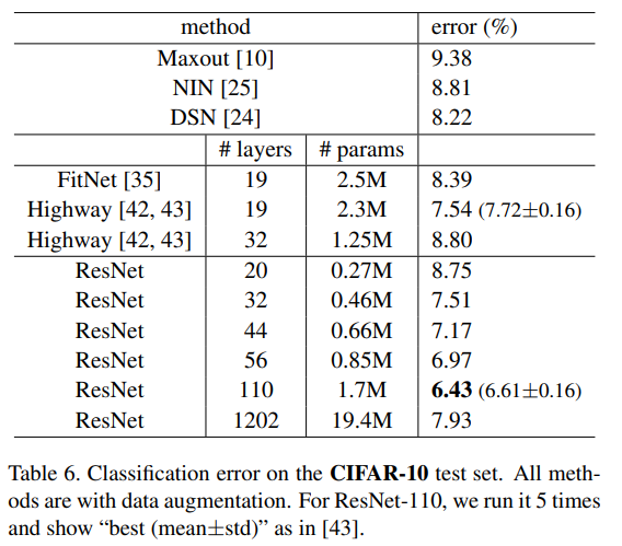 n=18(110-layer ResNEt)도 실험했다. 이 경우 learning rate가 0.1은 수렴하기에 너무 커서, 0.01로 training을 warm-up했다. Training error가 80%(약 400번 반복) 아래로 가면 다시 0.1로 돌아가서 training했다. 남은 learning rate는 이전과 마찬가지로 진행했다. 110-layer도 마찬가지로 잘 수렴했다. 이는 FitNet이나 Highway 같은 네트워크보다 더 적은 파라미터를 가지고 있지만, SOTA 수준을 보여줬다.
