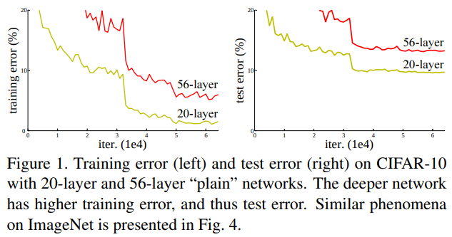 Figure 1은 "plain" network를 20, 56층 쌓은 것이다.