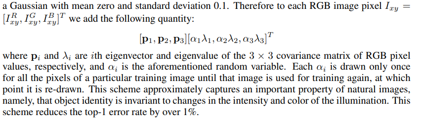 두번째는 PCA이다. 전체 ImageNet training set을 걸쳐 RGB 픽셀값에 PCA를 수행한다.