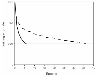 ReLU를 사용한 이유이다. 경사하강법 사용 시 수렴이 ReLU가 훨씬 빠르다. 위 그래프는 점선이 tanh, 실선이 ReLU이다. 각각 최대한 빠르게 수렴하는 learning rate를 사용했고, 그 결과 ReLU가 0.25 error에 훨씬 빨리 수렴하는 것을 볼 수 있다.