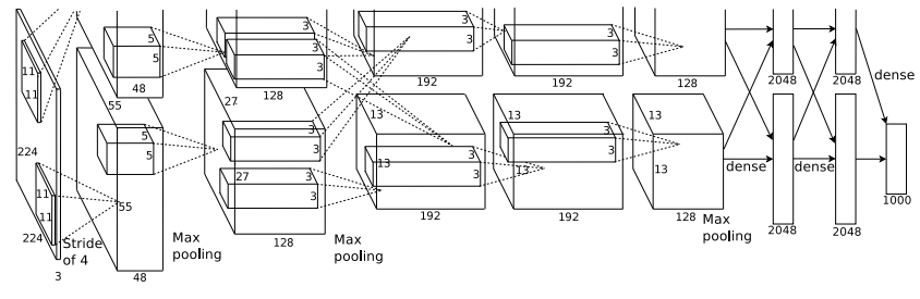 +) 아니 논문에는 224x224라는데 왜 227x227인가요? 왜냐하면 논문 저자들이 추후에 224가 오타라고 인정했기 때문이다.. 실제로 모델 그림을 보면 첫번째에서 224x224 라 가정할 시, 이고, 227x227로 하면 이다.