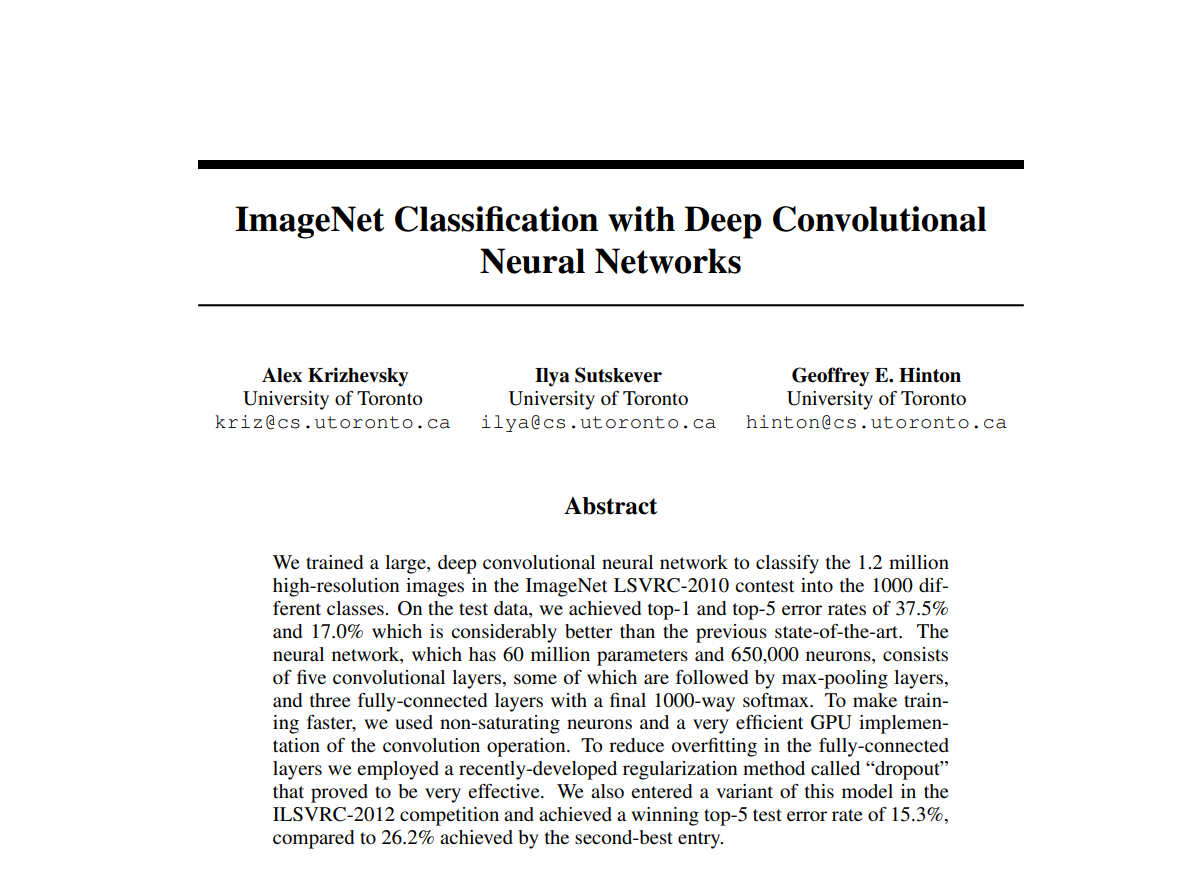 CNN Architecture를 사용해 ILSVRC에서 정확도를 획기적으로 높이며 주목을 받은 중요한 논문이다. 이전까지는 SVM과 같은 비-딥러닝 방식이 우세했으나 본격적으로 컴퓨터 비전에 딥러닝이 유용함을 보여준 첫 시작이라 볼 수 있다.