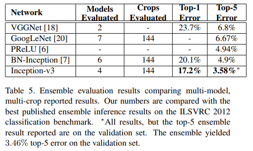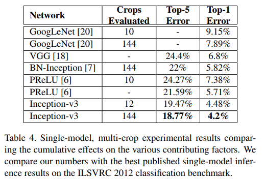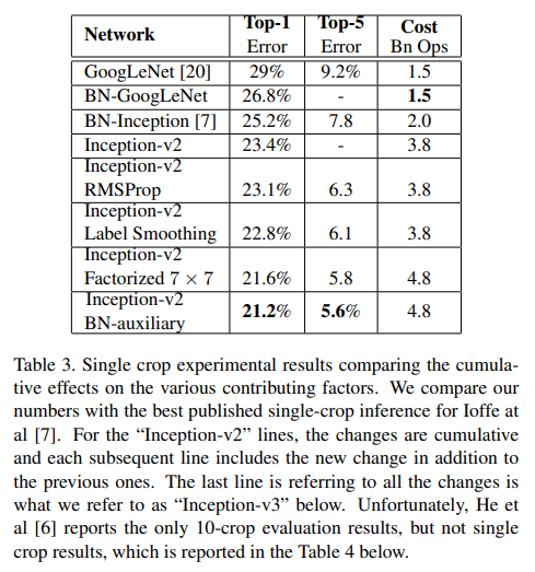 Table 3 예를 들어, 여기서 Inception-v2 Label Smoothing은 위의 RMSProp + Label Smoothing이다. 그래서 맨 아래의 행은 모두 다 적용된 "Inception-v3"이다. 이 결과는 single crop으로 평가되었다.