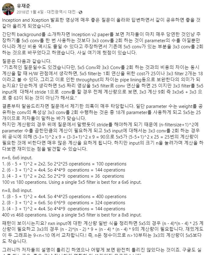 근데 계속 찝찝한 부분이 있다. 대체 3x3 conv 2개의 연산량이 왜 9+9일까? 25는 타당하다. 5x5 영역에 대해 5x5 conv filter가 1번 적용되니 총 25번 할 것이다. 근데 대체 3x3은 왜? 일단 5x5 영역에 대해 3x3 conv를 한 번 적용한다고 생각해보자. 총 9 set의 연산이며, 각 연산마다 9번의 연산이 있다. 총 81회. 그 다음 3x3 영역에 대해 3x3 conv를 하면 9회의 연산이 있다. Total 90회. 이는 5x5에 비해 무척 많은 수이다. 그래서 내가 계산을 잘못한건지 의문이 생겨 검색한 결과 아래의 답변이 있었다.
