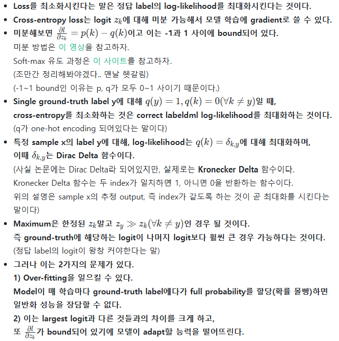 바로 Label-smoothing regularization, LSR이다. 이는 log-likelihood를 최대화하는 것이 목적이라면 적합하지 않다. 다만 모델을 regularize하고 더 adaptable하게 하는 것이 목적이라면 적합하다.