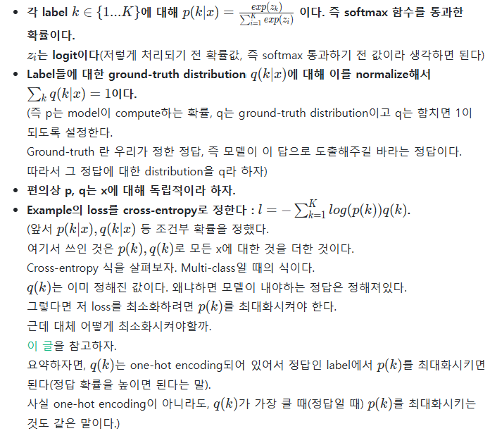 그러므로, LSR은 single cross-entropy lossH(q,p)를 pair of lossH(q,p),H(u,p)로 대체할 수 있다. 두번째 loss(H(u,p))는 prior u의 분포 p로 penalized된다. (즉 u와 p 분포 차이만큼 패널티 받는다고 생각하면 될듯, 여기서 u는 uniform-distribution으로 설정했으니 p(모델이 계산한 확률분포)가 한 곳에 몰리면 큰 패널티를 받음)