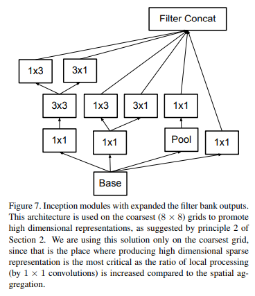 가장 축소된 8x8 level에서는, 2개의 Inception이 Fig. 6(비대칭 conv)의 방법으로 적용되었다. Output은 2048의 filter로 concatenate되었다.