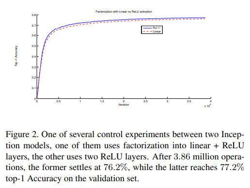 저자들은 몇 번의 실험을 거쳐 linear activation이 더 좋지 않은 성능을 보여줬다고 한다. (즉 ReLU를 끼워넣는게 더 성능이 좋다) 이 이득은 네트워크의 space of variation(=model capacity) 증가에 도움이 된다. 특히 output activation을 batch-normalize 했을 때 더 그렇다고 한다.