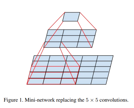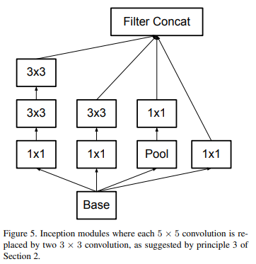 위 사진을 보면 알 수 있듯이 5x5 conv가 5x5의 영역을 1x1로 만드는 것을 5x5 영역을 3x3 conv로 먼저 capture(하면 3x3이 됨, stride=1, padding=0), 3x3 영역을 다시 3x3 conv(처음엔 FC였지만 conv로 대체)로 capture하여 1x1이 된다.