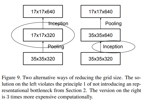 Pooling을 먼저하고 conv를 하면, size가 작아져서 representational bottleneck이 생긴다. (즉 담을 수 있는 정보가 작아진 채로 conv를 해서 소실된다는 뜻) 따라서 conv를 먼저하고(=filter를 먼저 늘리고) pooling을 하는 것이 맞다. 근데 그러면 컴퓨팅 비용이 너무 많아진다.