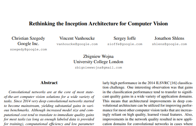 이 논문에서 저자는 design principle을 제시하고, Inception 구조를 연구했다. 그 결과 Inception-v3는 single crop으로 top-1/top-5 error를 21.2%/5.6%로 달성했다(SOTA). 4개의 Inception-v3 ensemble은 multi-crop 평가에서 top-5 error가 3.5%였다. 이는 타 논문들에 비해 획기적인 수치이다.