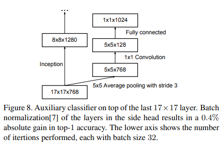 Fig. 8, 마지막 17x17 layer의 최상위에 있는 보조 분류기 모습 BN을 사용하면 top-1 accuracy가 0.4% 증가했다.