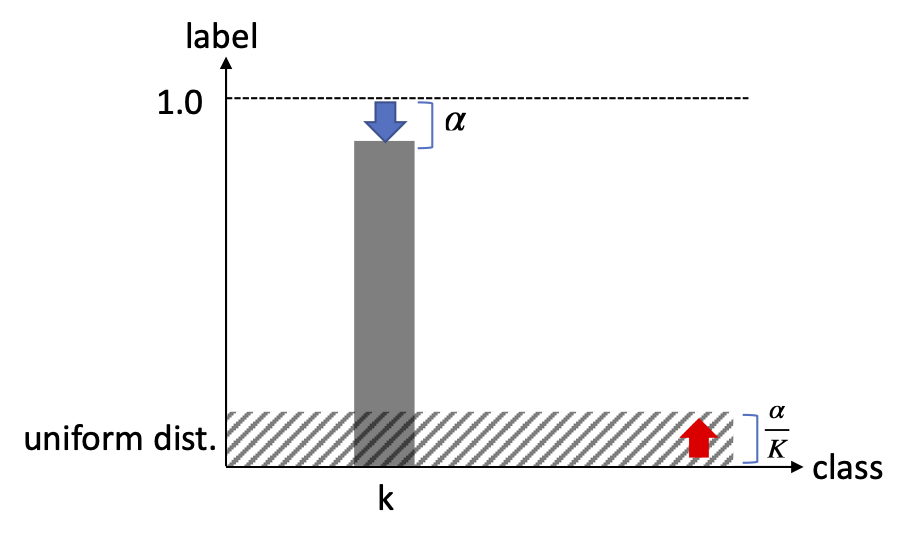 (즉 기존의 label ground-truth 확률을 약간 낮추는 것) 이 논문에서는u(k)=K1인 uniform-distribution을 사용해 식은 다음과 같아진다.